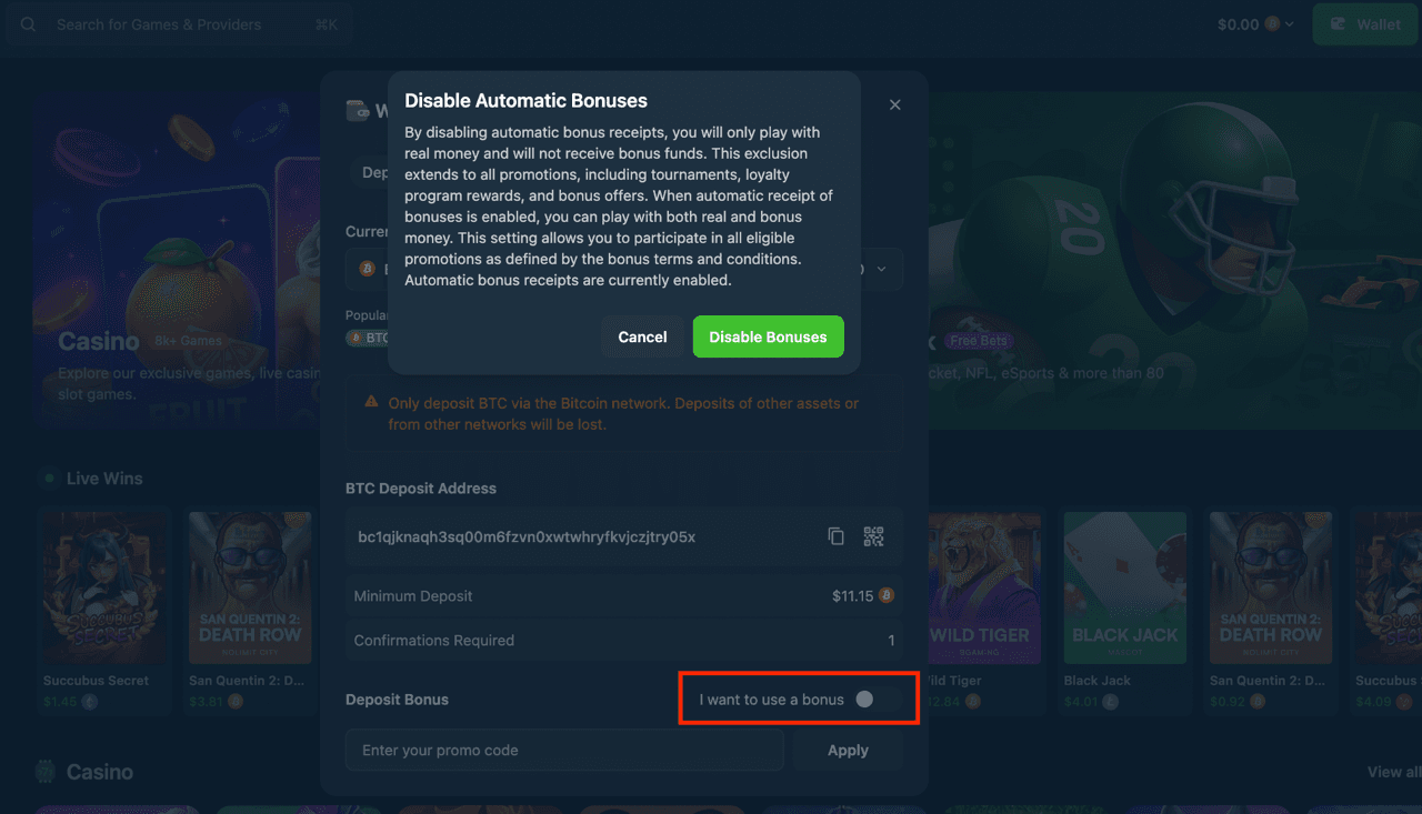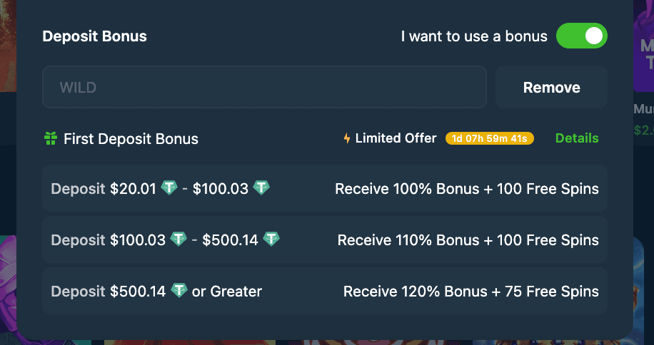 Once you are a Wild.io member, the first thing you should do is make a deposit into your account. Making a deposit is a breeze, especially when you can choose between several cryptocurrencies. At Wild.io, you can deposit in BTC, BCH, ETH, LTC, DOG, USDT, USDC, XRP, ADA, TRX, BNB, and SOL.